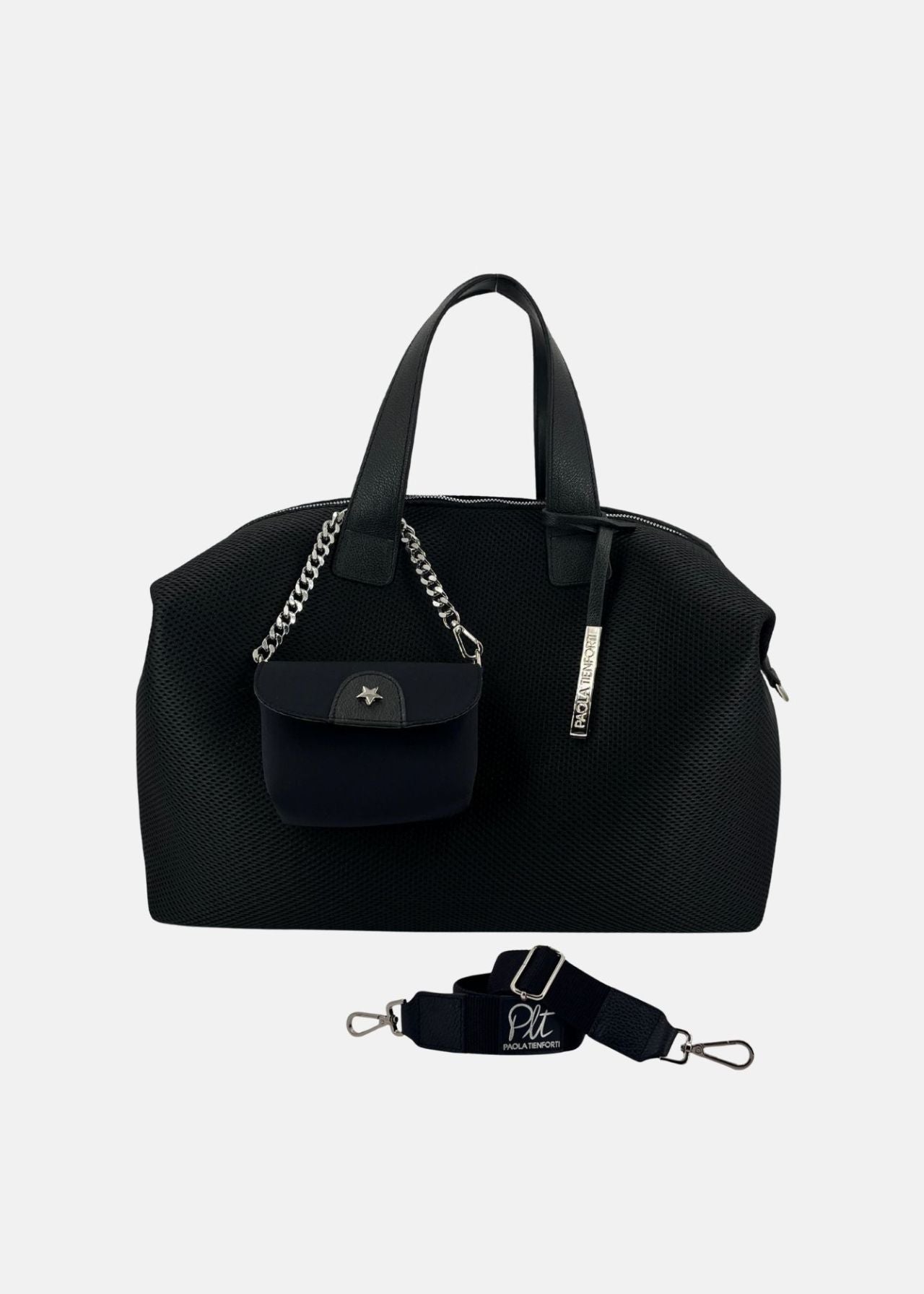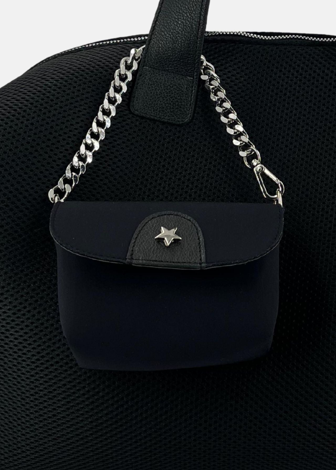 Linee pulite e colore nero per un look versatile, dal giorno al viaggio. - 🔗 Mini pochette removibile con catena