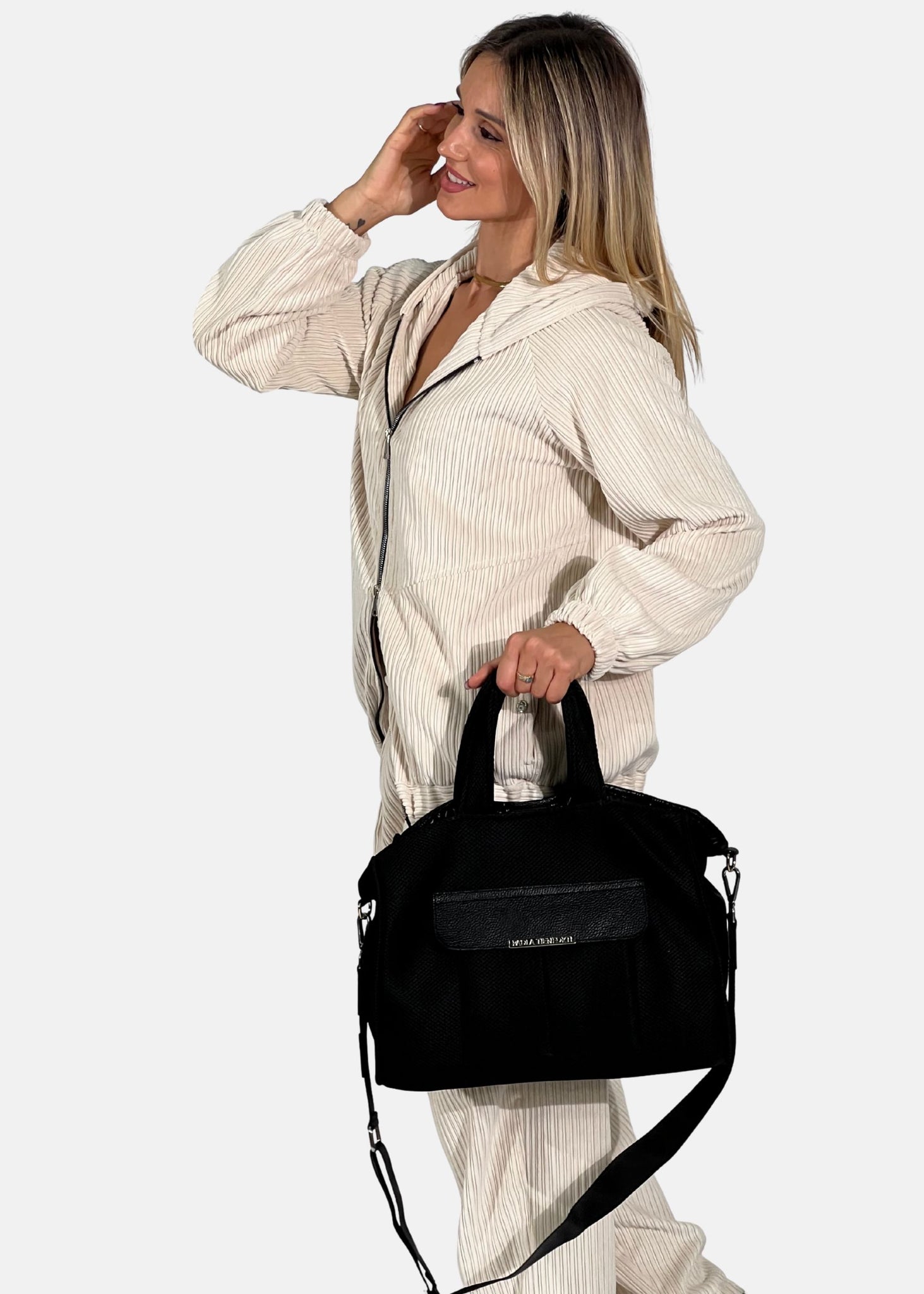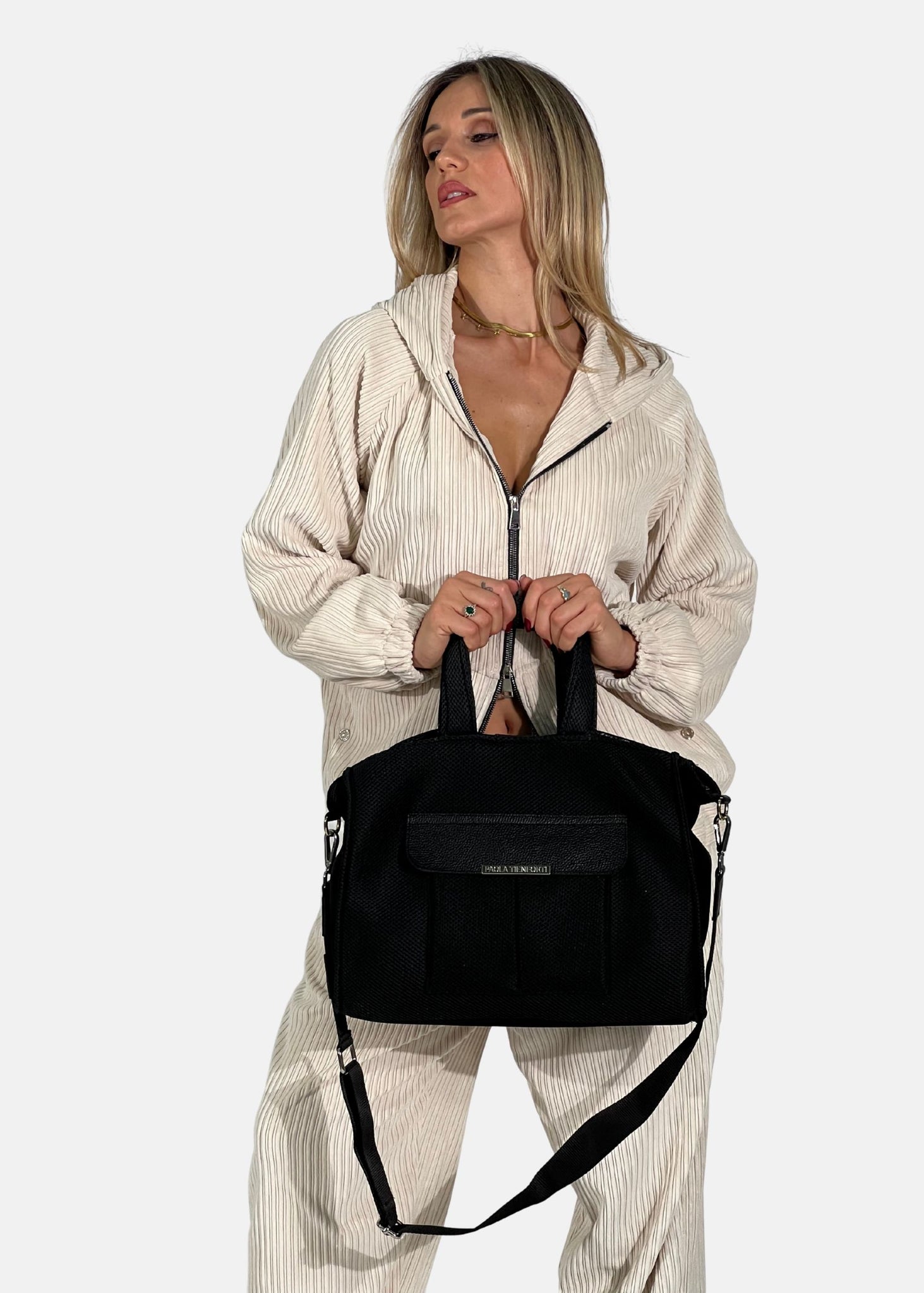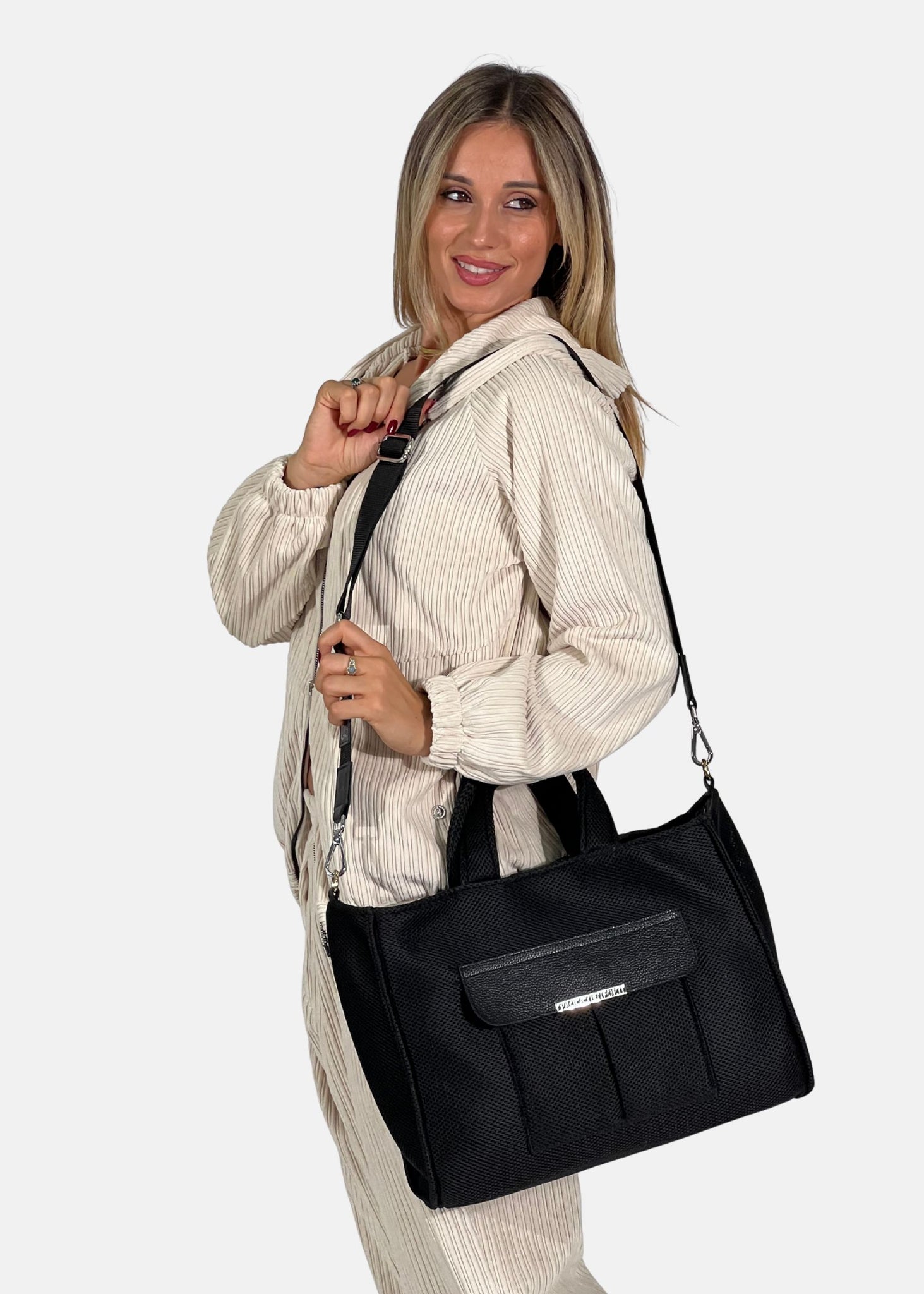 Manici a mano + anelli laterali per aggancio tracolla - Tracolla logata rimovibile in nastro e finiture in vera pelle
