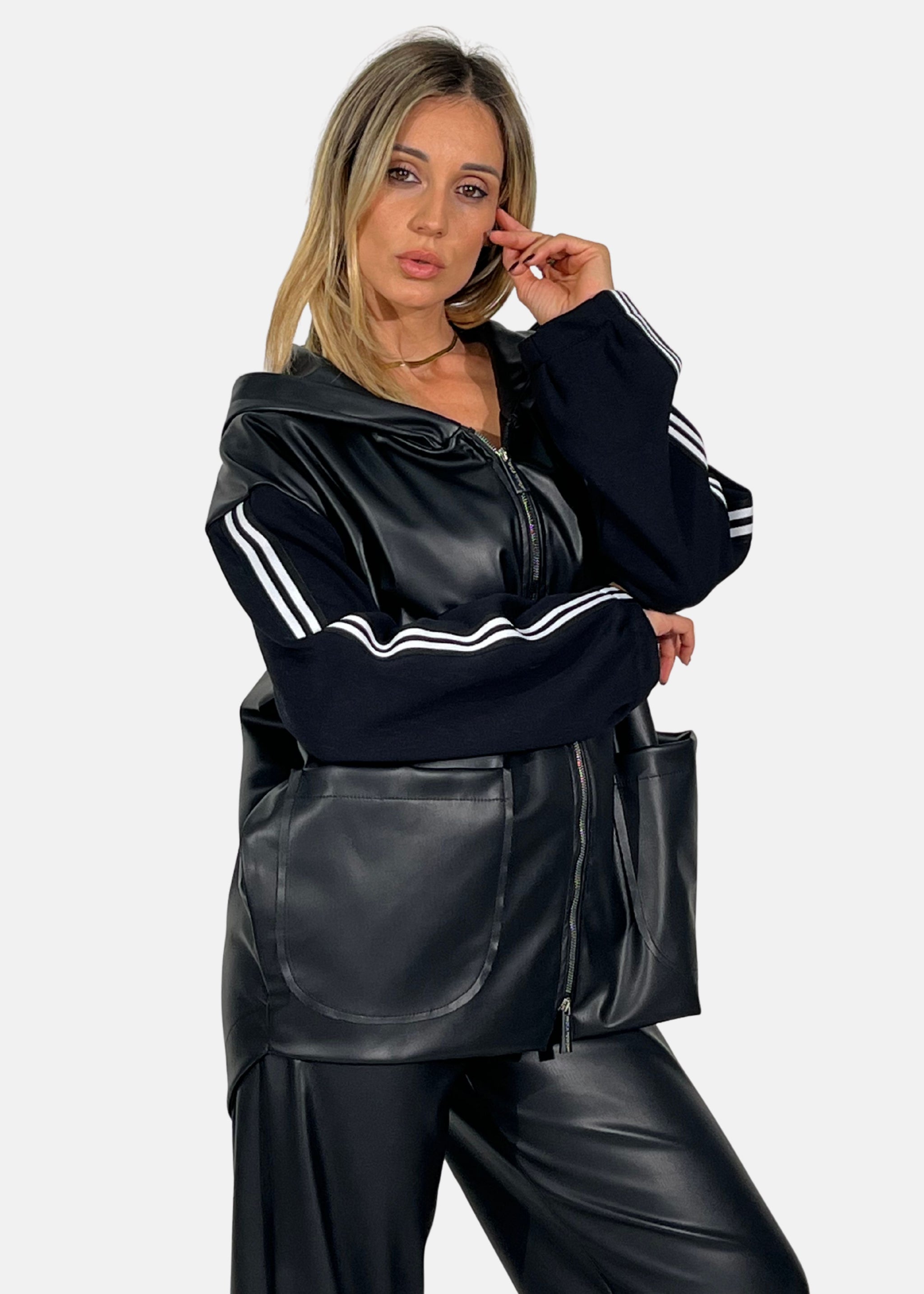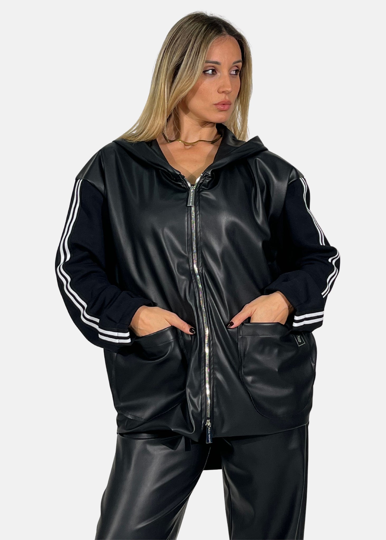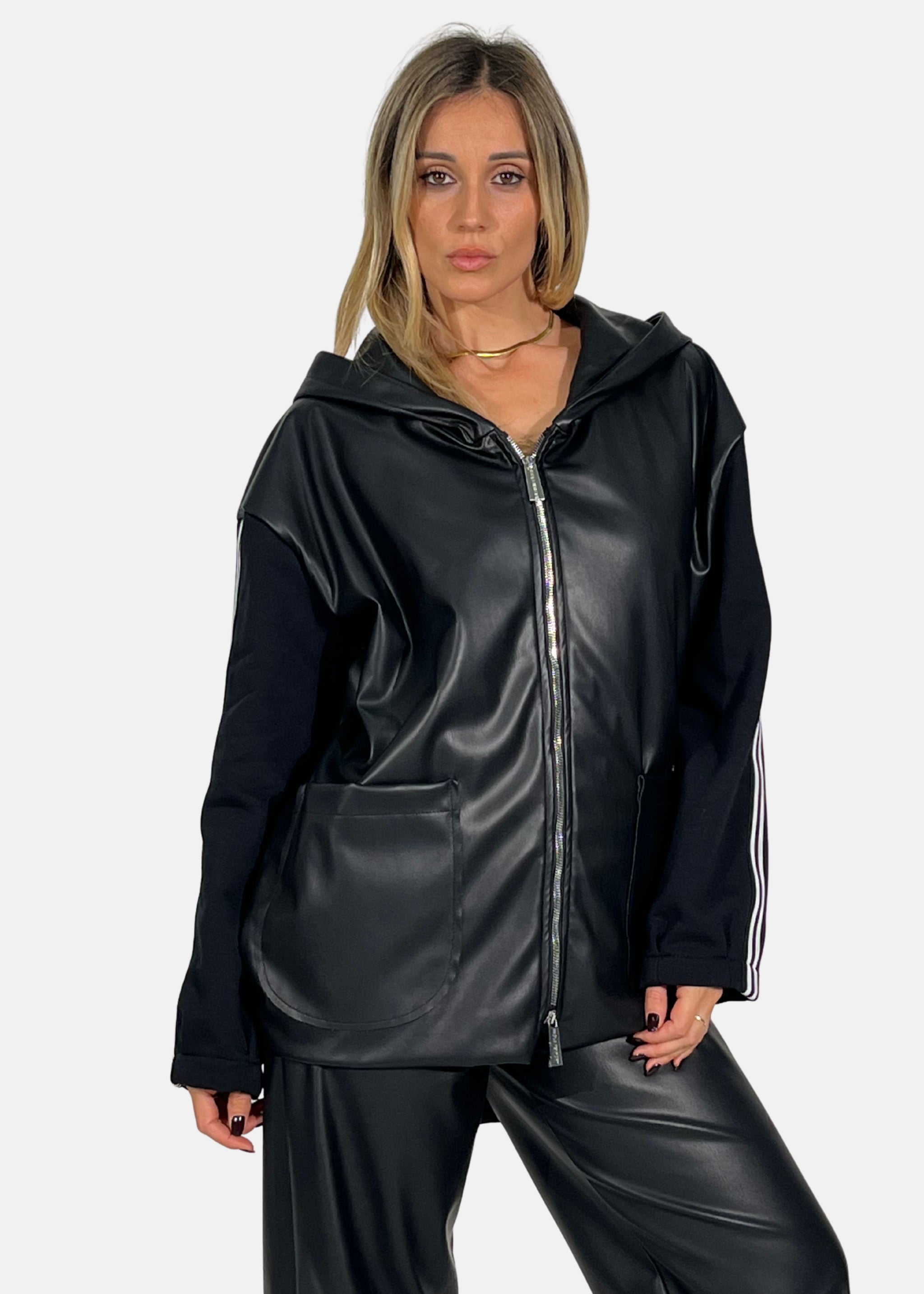 Giacca Over in ecopelle con maniche in felpa