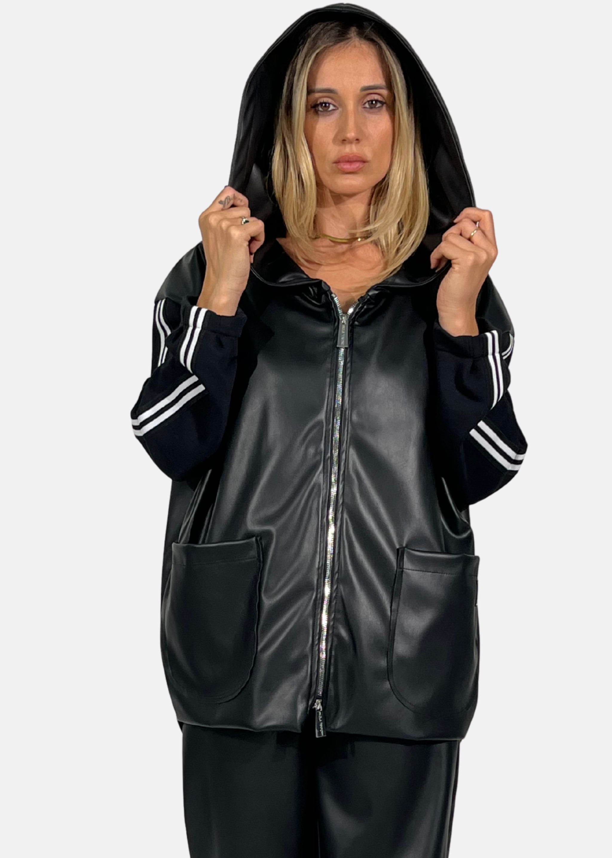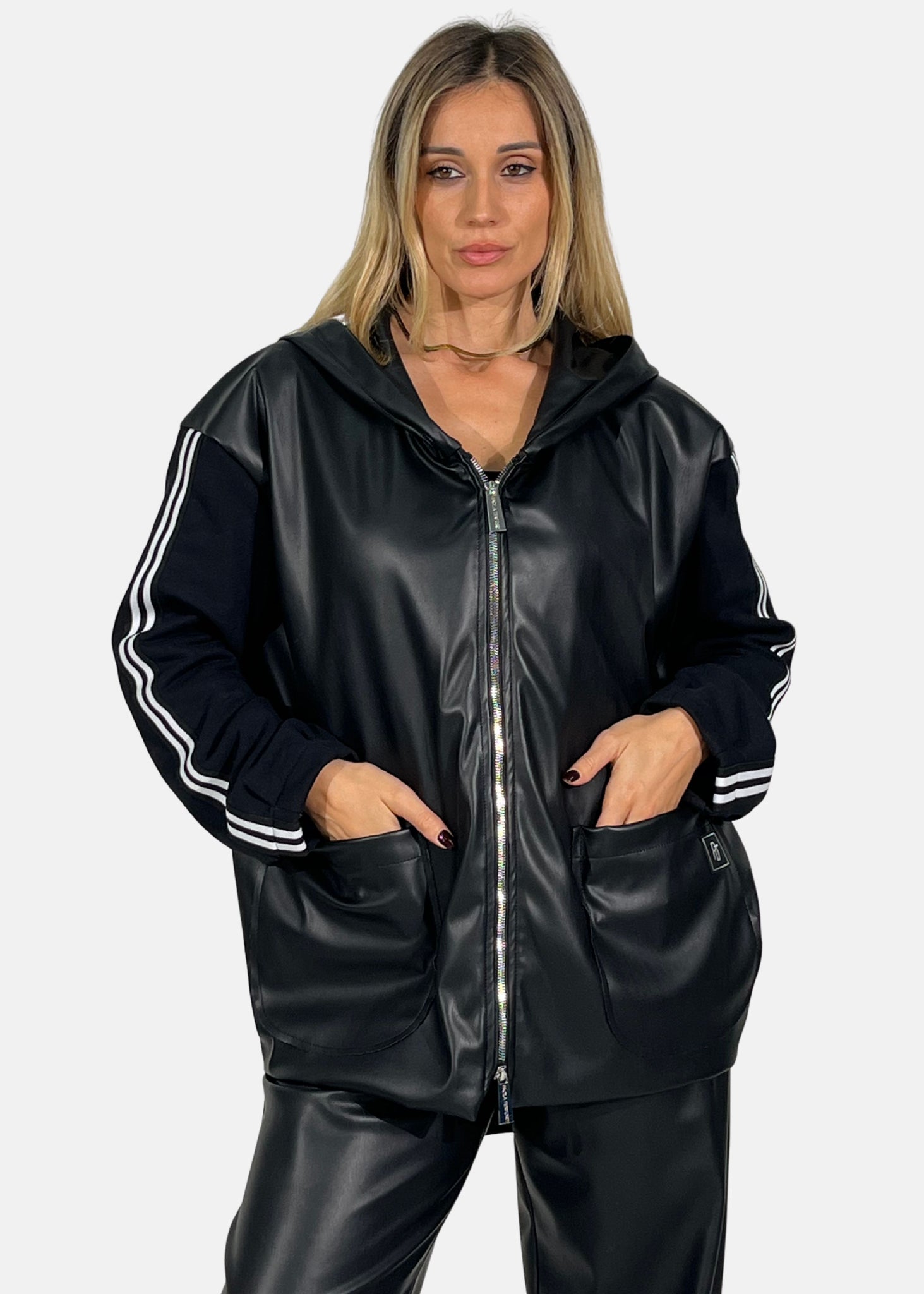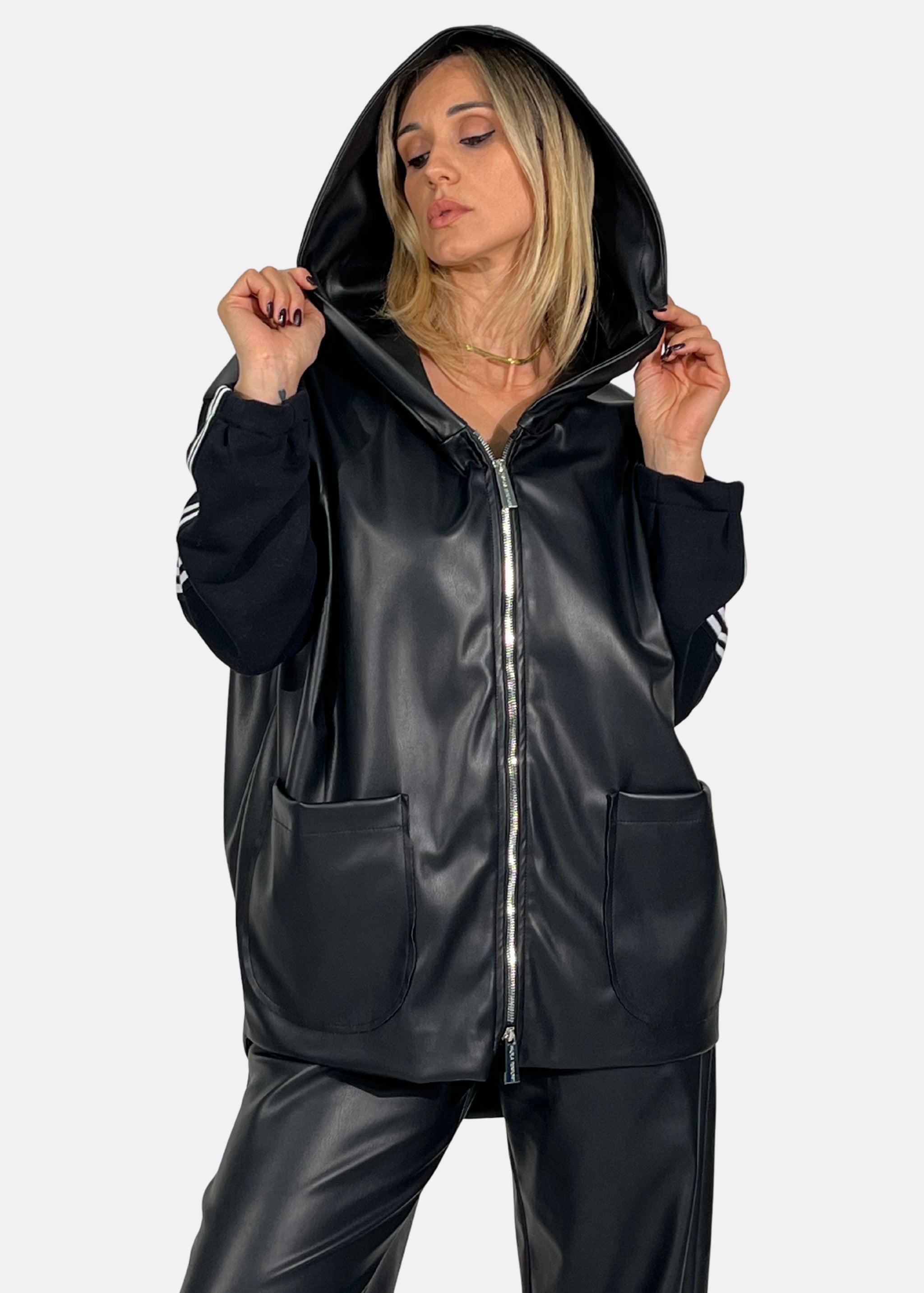 Giacca Over in ecopelle con maniche in felpa